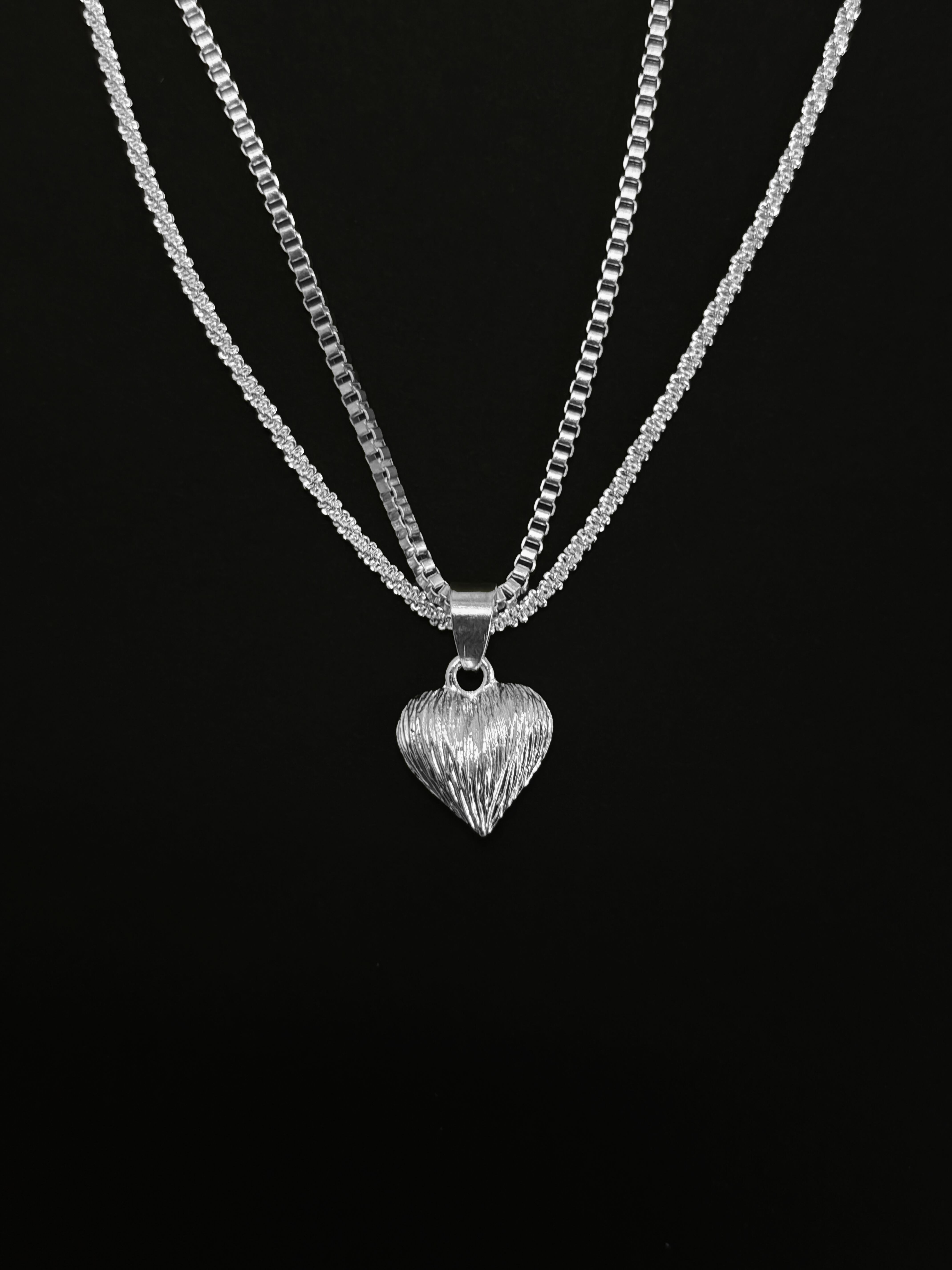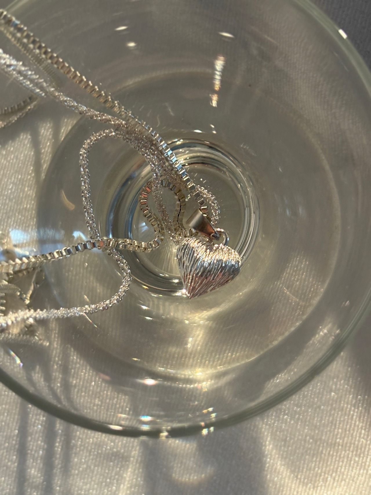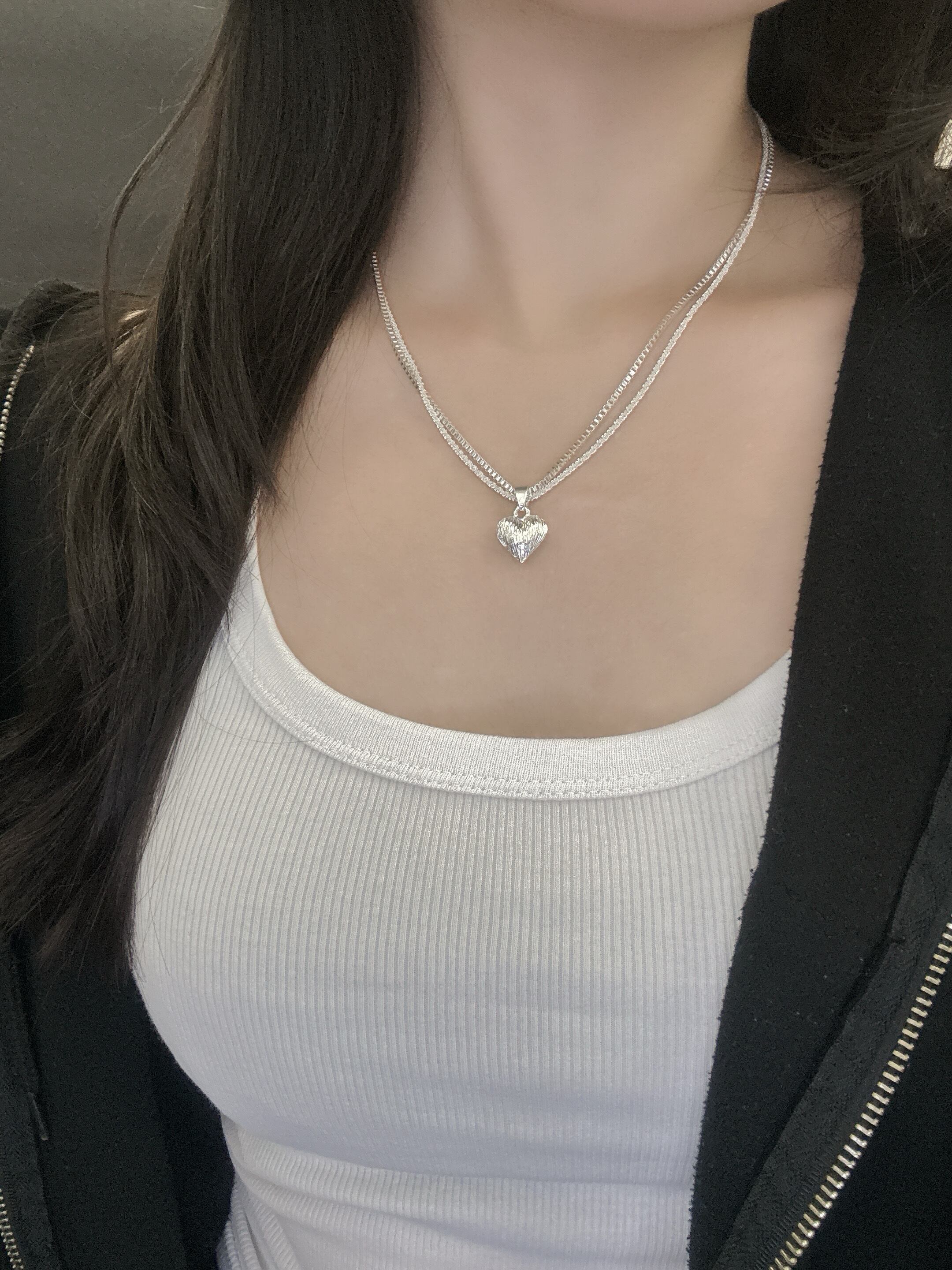 小さなハートチャームが胸元で静かにきらめく、繊細なデザインのネックレス。