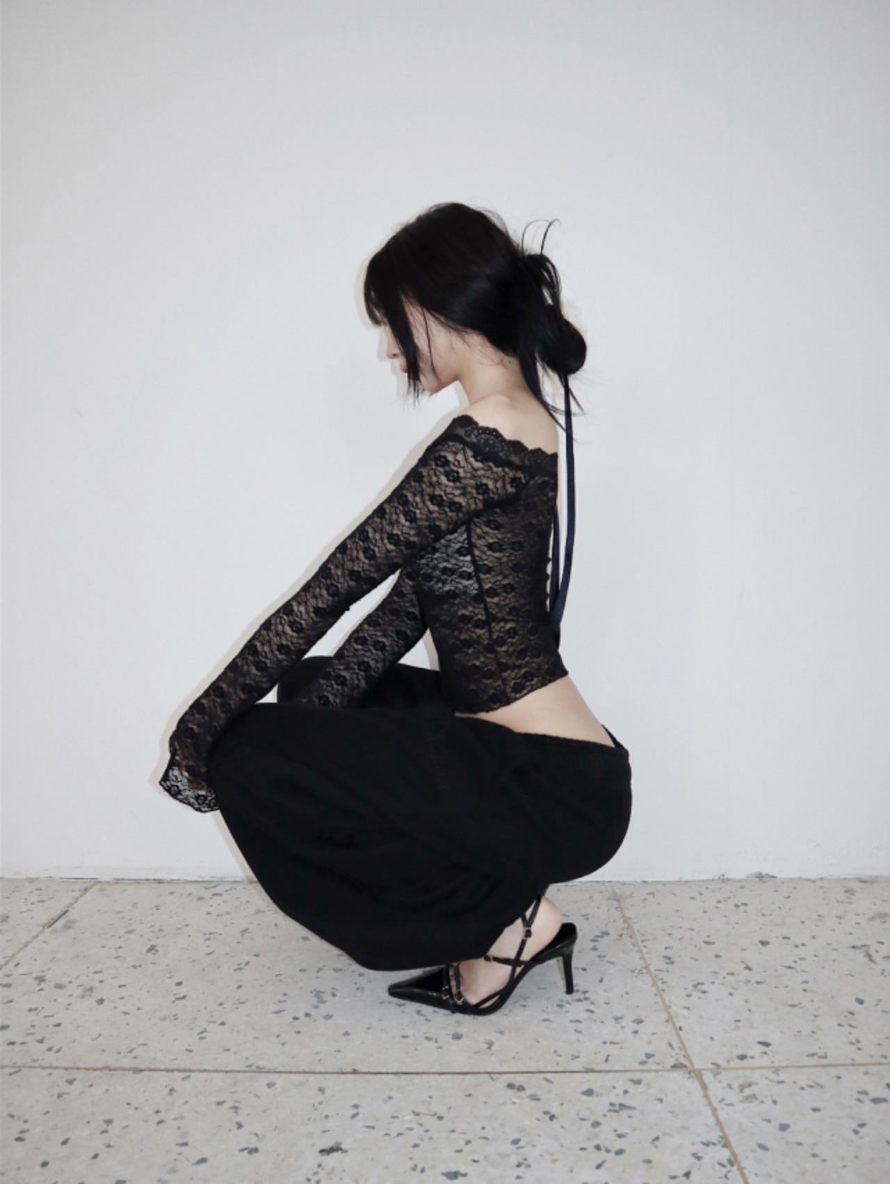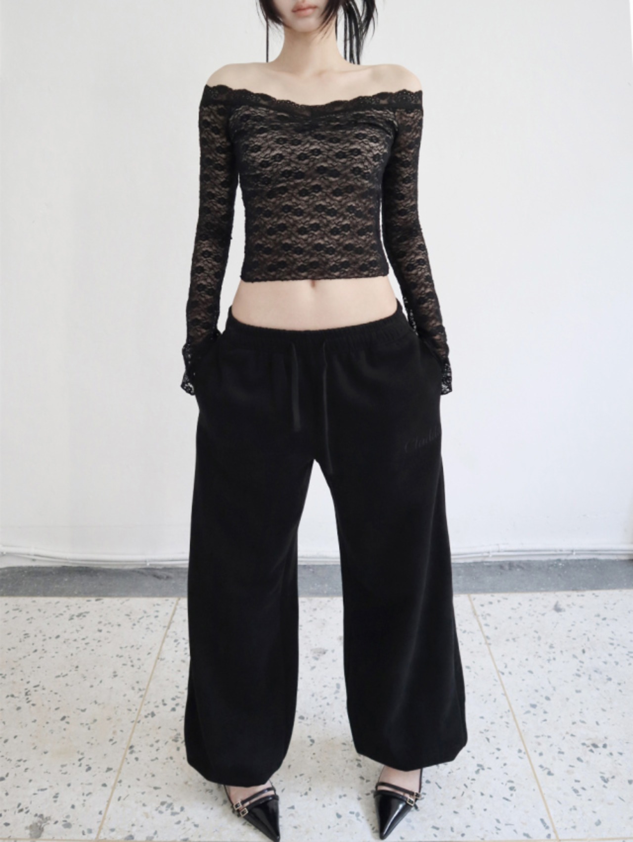 総丈は長めで、裾が少しだけ隠れるようなルーズなシルエットで完成。
