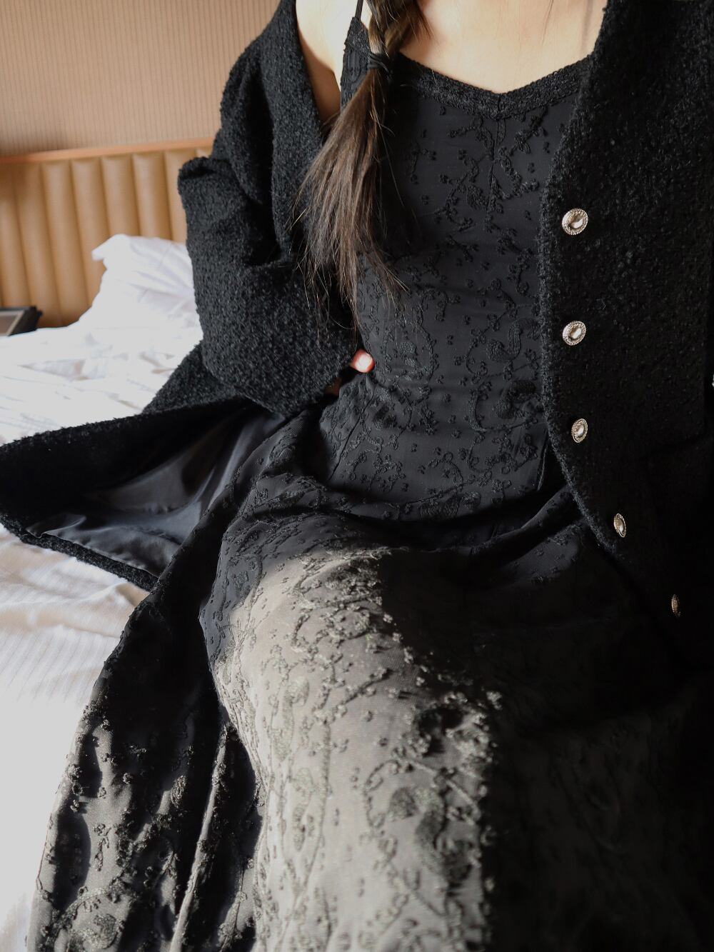 ツイードジャケットではあまり見かけることのないオーバーサイズの商品です。カチッとした印象を与えやすいツイードジャケットがオーバーサイズになることで、程よい抜け感を演出してれます。ロングスカートやバギージーンズと合わせるのが特におすすめです୨୧